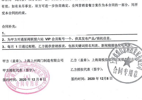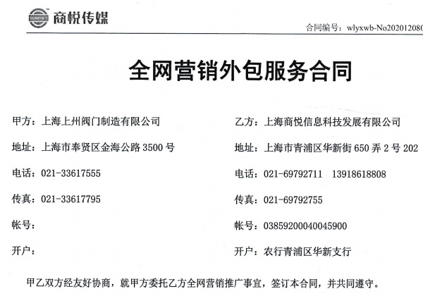 近日,商悅傳媒與上海上州閥門制造有限公司簽訂了12個月的網絡營銷外包服務合同。