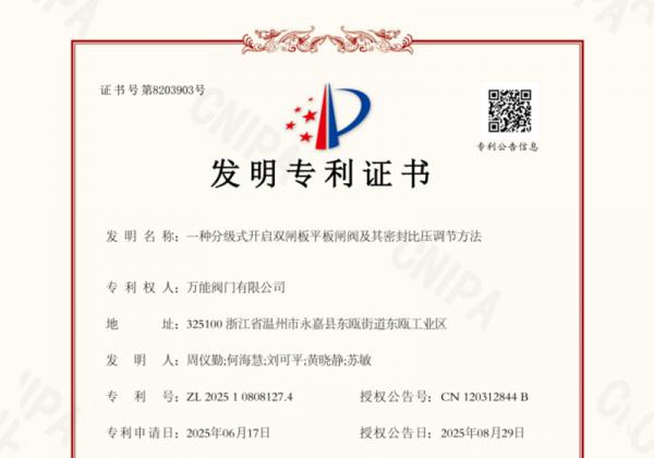 近日,萬能閥門有限公司傳來喜訊,公司成功取得一項(xiàng)名為“分級式開啟雙閘板平板閘閥及其密封比壓調(diào)節(jié)方法”的國家專利(專利號:ZL 2025 1 0808127.4,授權(quán)公告號:CN 120312844 B)。這一成果標(biāo)志著企業(yè)在平板閘閥研發(fā)與制造領(lǐng)域再次取得突破,也進(jìn)一步彰顯了公司持續(xù)創(chuàng)新與注重品質(zhì)的理念。